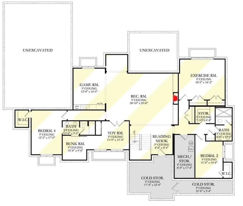 The basement includes a recreation room, game room, exercise room, two additional bedrooms with walk-in closets, and a bunk room attached to a toy room.