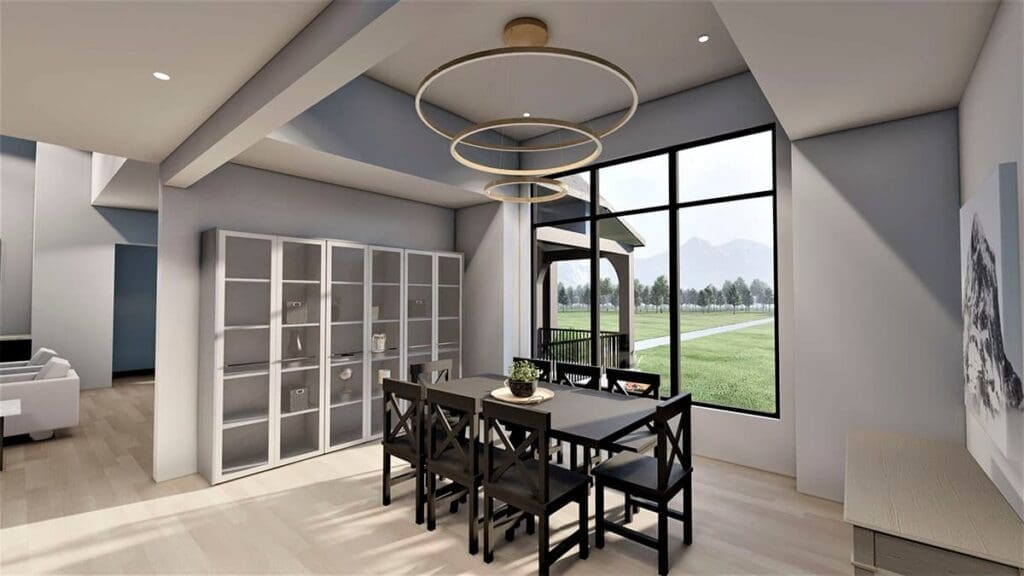 The dining room is positioned off to the side, creating a semi-private area for meals while maintaining connection to the main living space.