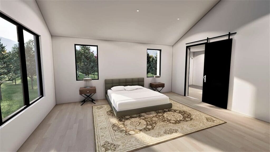 Vaulted ceilings add volume, and the room’s size allows for flexible furniture placement.