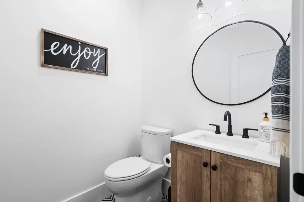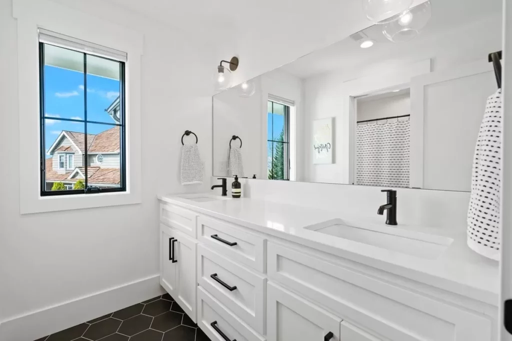 Two bathrooms are thoughtfully placed so there’s no morning mayhem over mirror time.