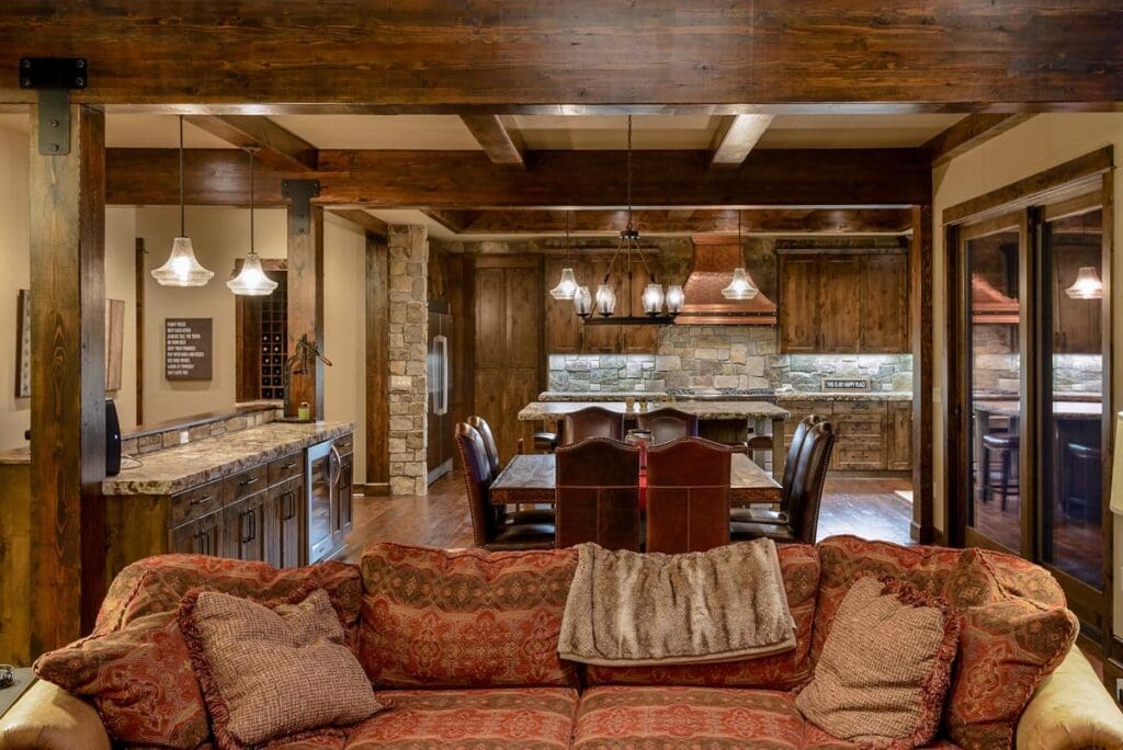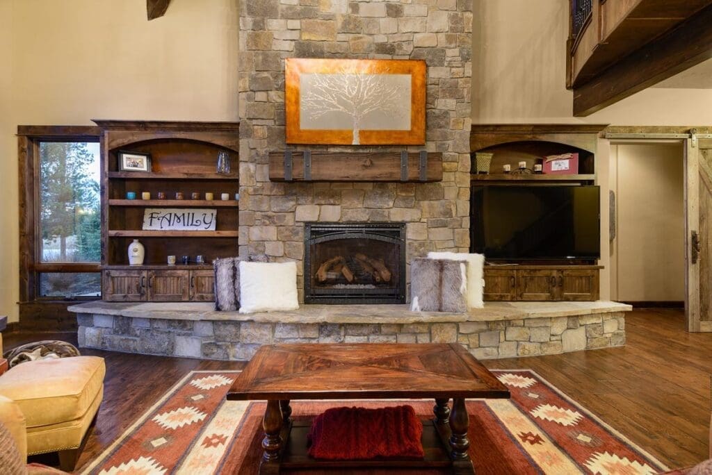 With a towering fireplace, oversized windows, and open sightlines to the kitchen and dining area, this space was built for gathering—whether it’s a casual family night or a full-blown holiday bash.