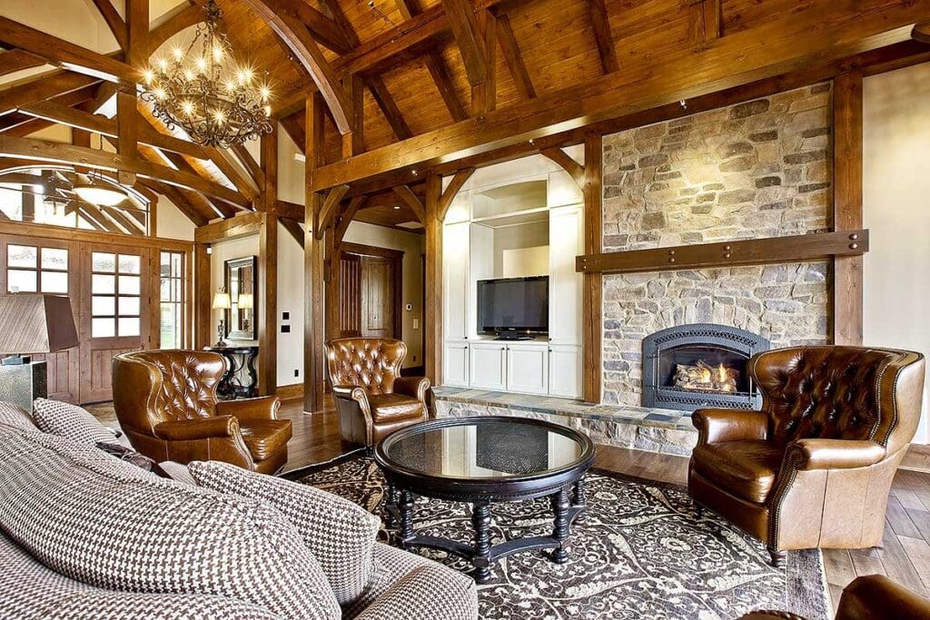 Vaulted ceilings, a showpiece fireplace, and built-ins that are both stylish and practical make this room the heart of the home.