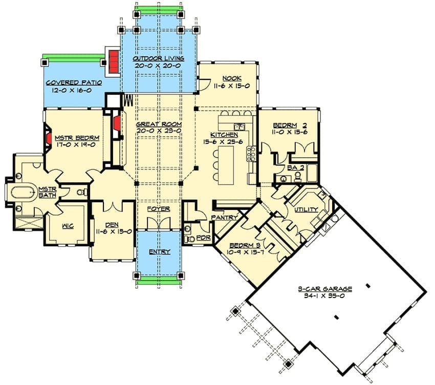 3-Bedroom 1-Story Craftsman House with Front-to-Back Views (Floor Plan)