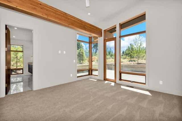Wall-to-wall windows in the great room allow sunlight to fill the space from morning to evening, and the placement of glass doors provides easy access to outdoor areas.