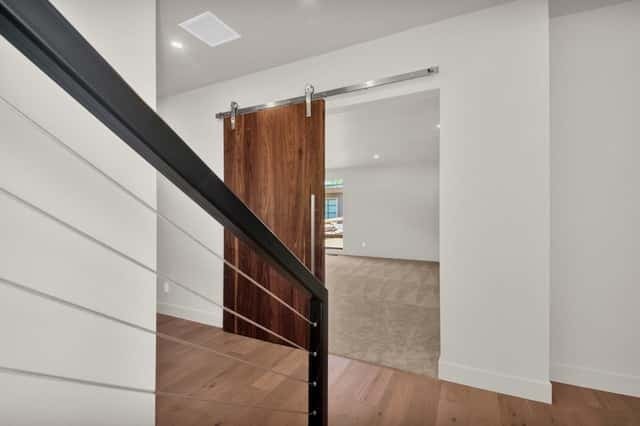 The three-car garage opens into a practical mudroom, complete with a barn door leading to the laundry area.