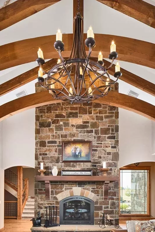 Step inside to high ceilings adorned with rustic beams that set a grand stage, complemented by both interior and exterior stone accents that add a dash of rugged elegance.