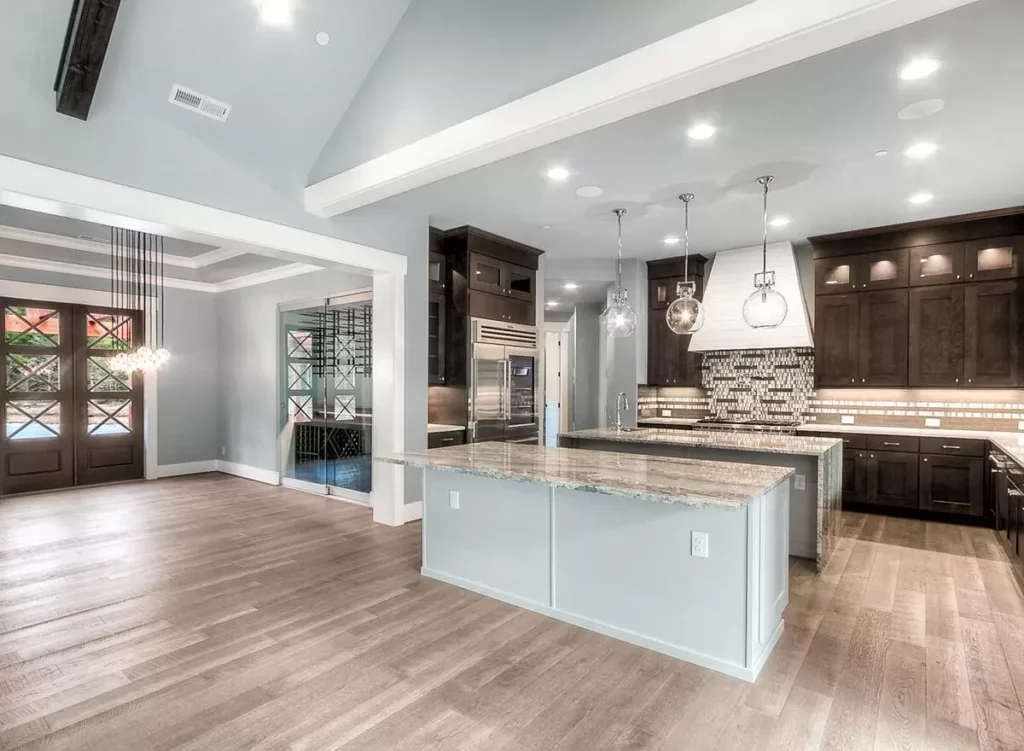 As you move through the house, you’ll notice the tasteful interior columns that rise like exclamation points, punctuating the elegance of the design, alongside special ceiling treatments that might just make you feel like neck stretches are a good idea after all.