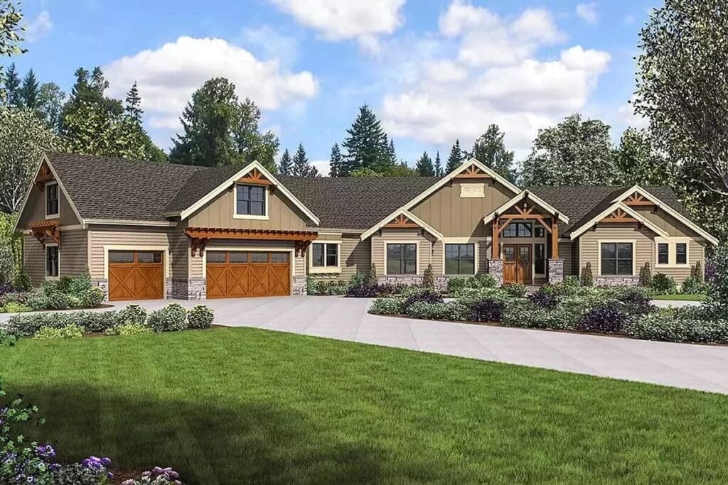 This home plan beautifully marries the rustic charm of a mountain craftsman style with modern needs.