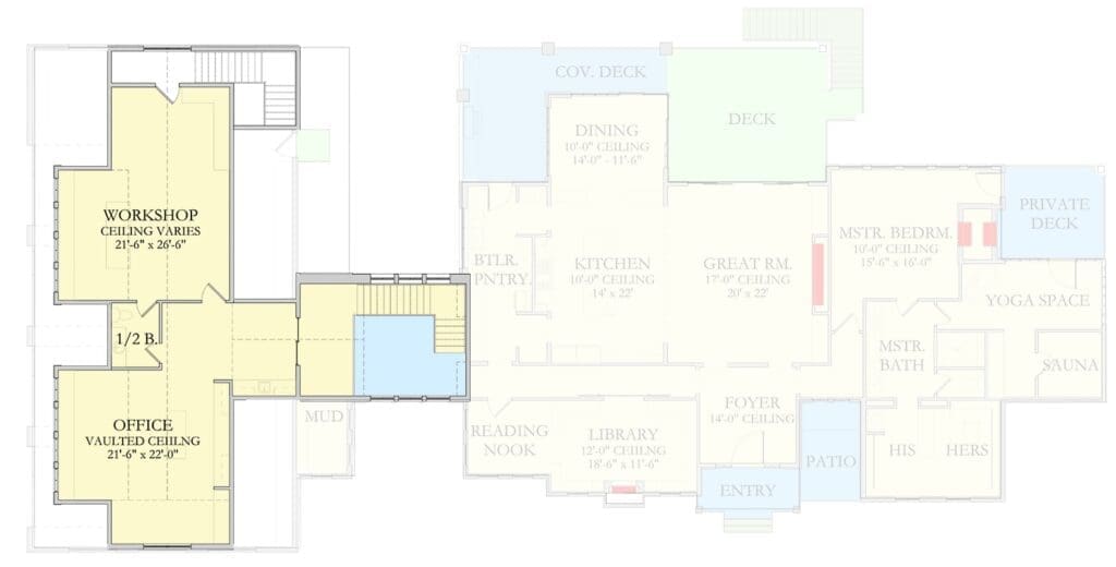 This plan’s four-car garage is much more than just a place to park.