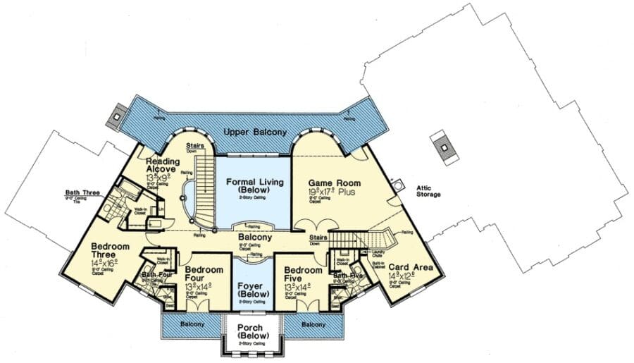 Both the reading alcove and the game room lead out to an upstairs balcony.