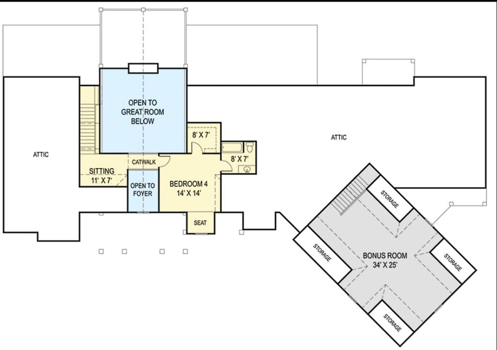 This home plan offers not one but two staircases leading to optional upper-level spaces.
