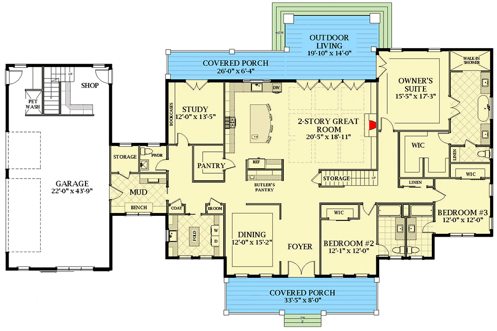 The house plan includes generously-sized service areas throughout the main level—think mudroom, laundry, pantry, and storage galore.