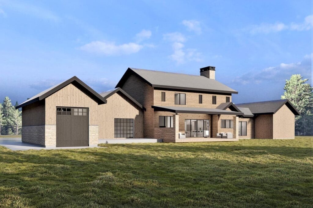 The exterior design features metal and flat roofs combined with timber accents, giving the home its modern farmhouse aesthetic.