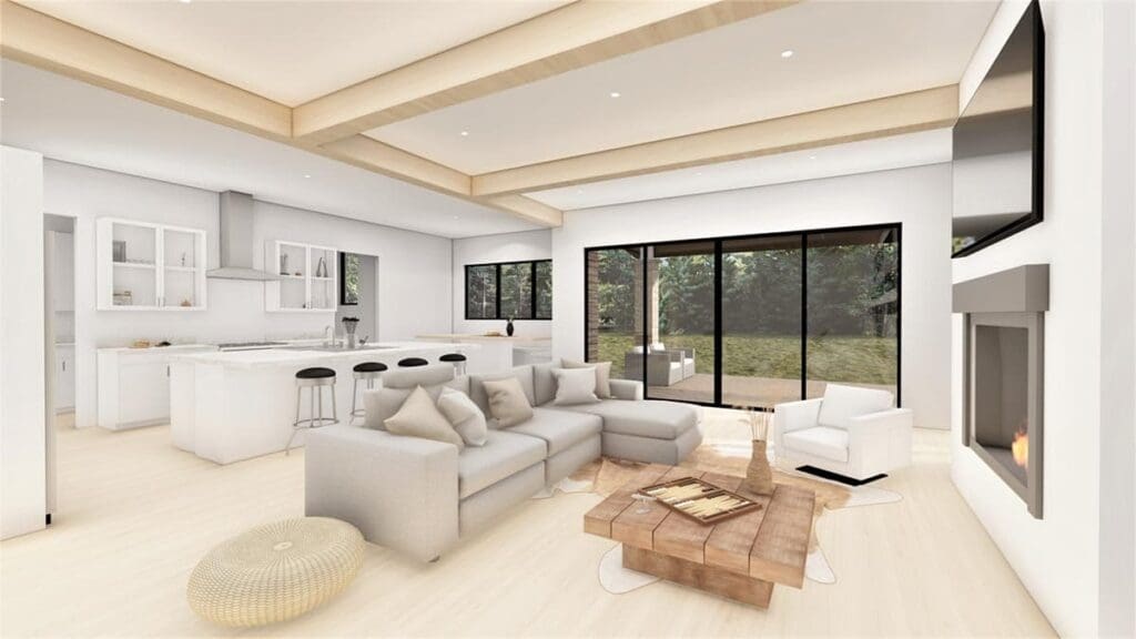 The open layout allows light and people to flow naturally, with the pass-through fireplace serving as both a design feature and a practical divider between spaces.