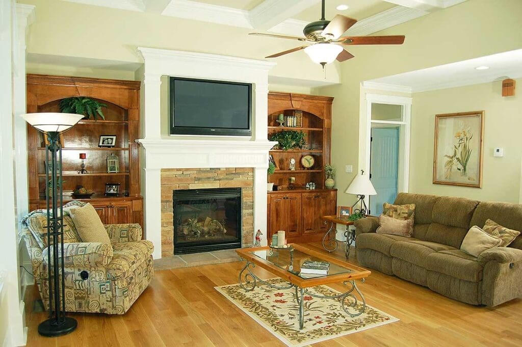 Built-ins surrounding the fireplace add both storage and style. Whether you fill them with books, vases, or quirky travel finds, they give the room a curated feel without needing a degree in interior design software to figure out what goes where.