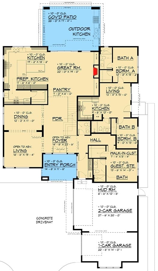 This plan maximizes outdoor functionality with multiple covered and open-air areas.